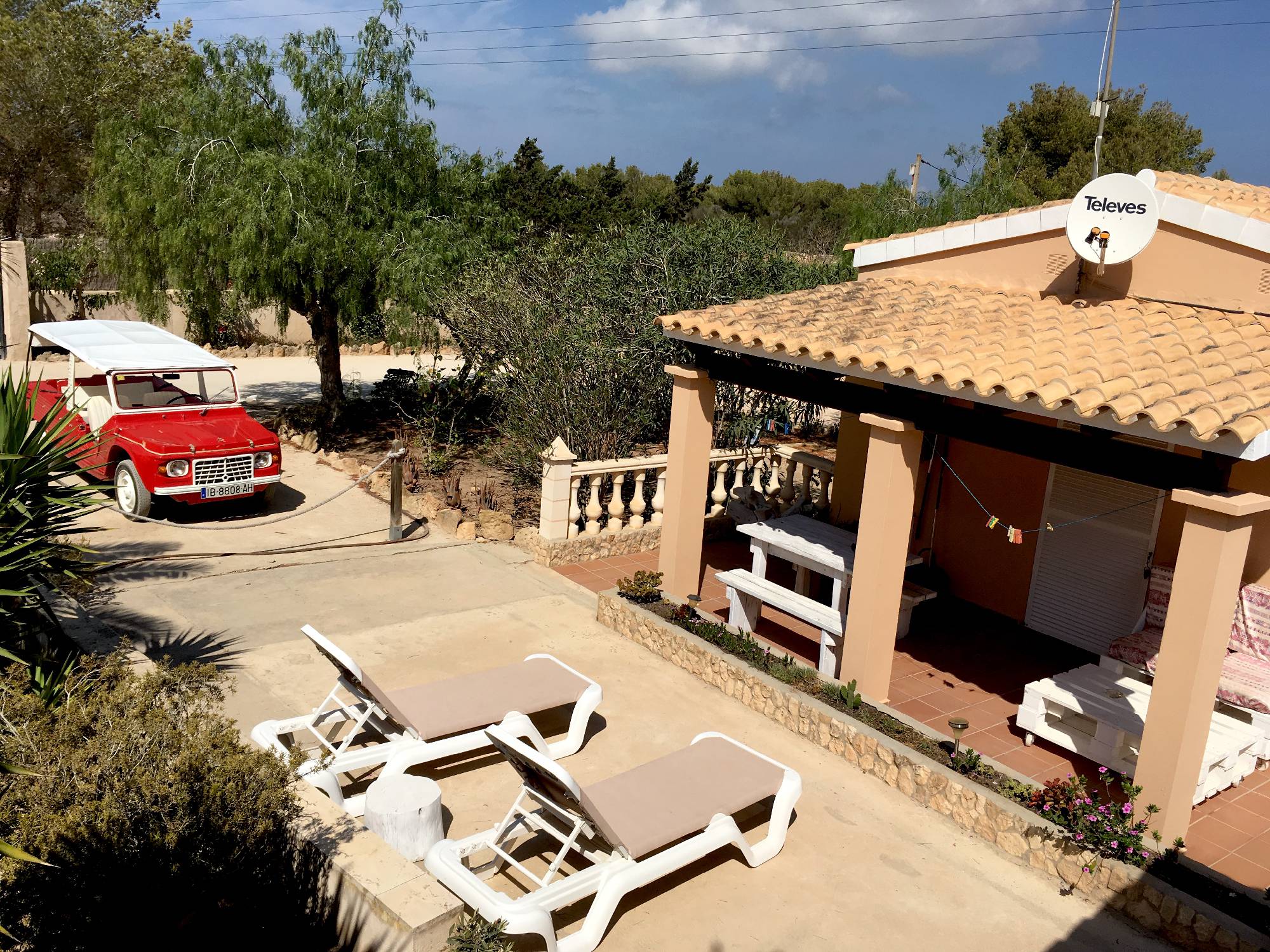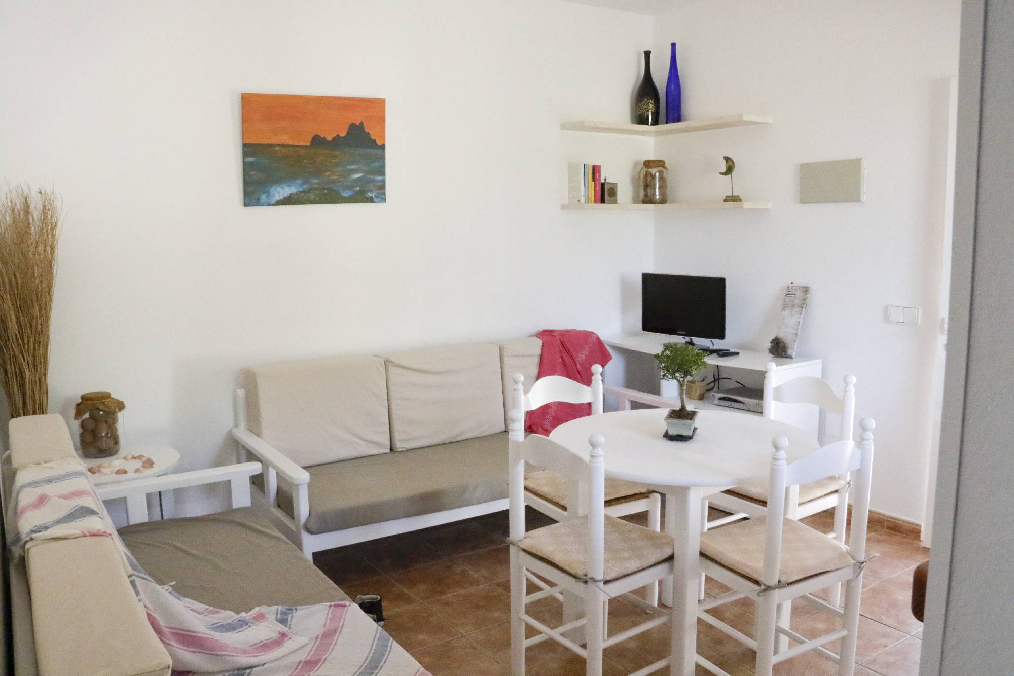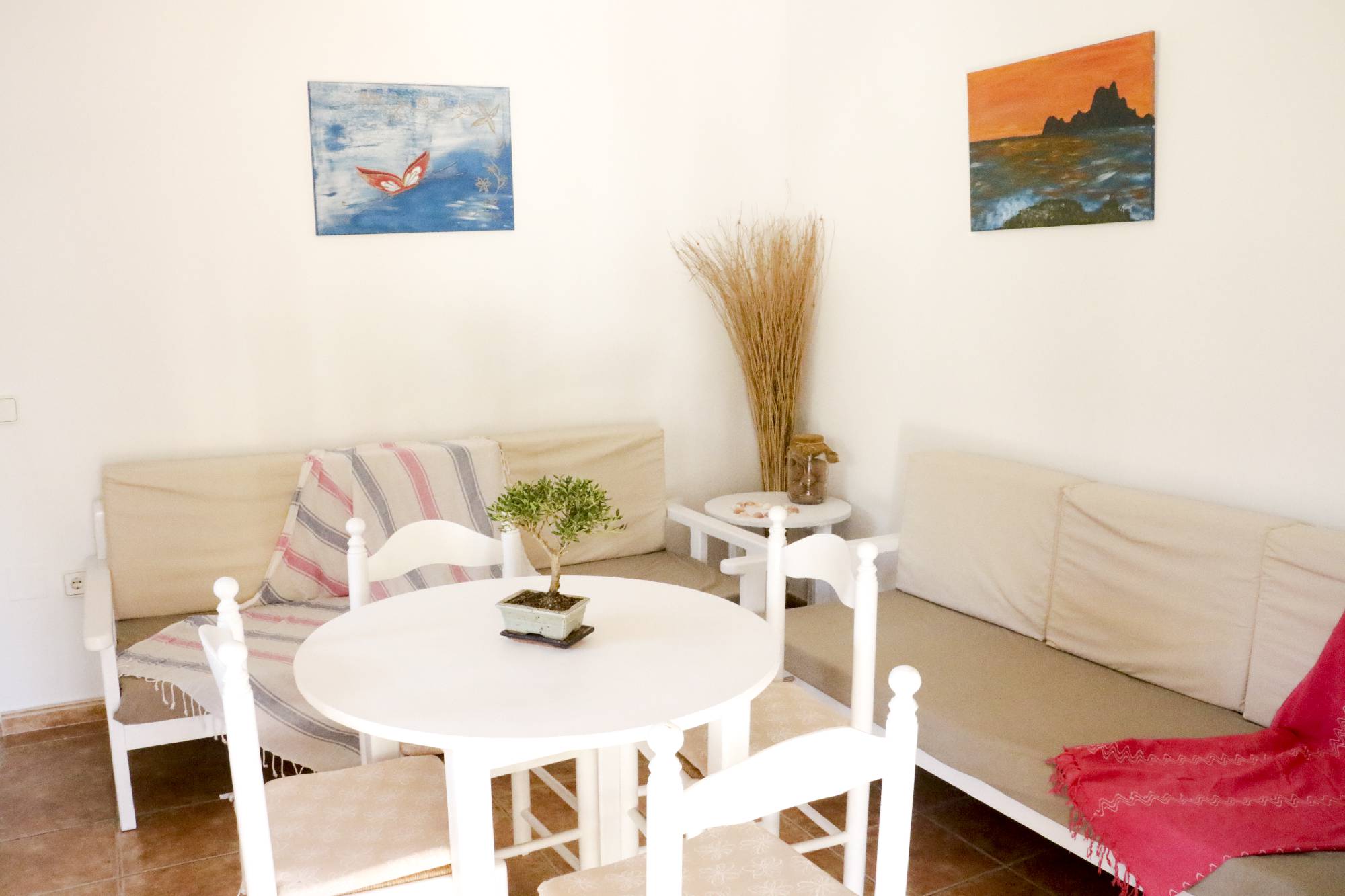 -Descripción: El apartamento se encuentra a 300m de la playa mitjorn, cerca del Kiosco Lucky! El apartamento esta dentro de un recinto privado, rodeado de naturaleza y un bonito jardín, una zona tranquila, perfecta para pasar unas vacaciones relajantes. Bonito, sencillo y practico apartamento, con un dormitorio con 2 camas individuales(opción de una cama matrimonial), baño, salon (2 sofas-camas),con cocina barra americana y una estupenda terraza (chill-out) con buenas vistas. El alojamiento es bueno para parejas y familias (con hijos).